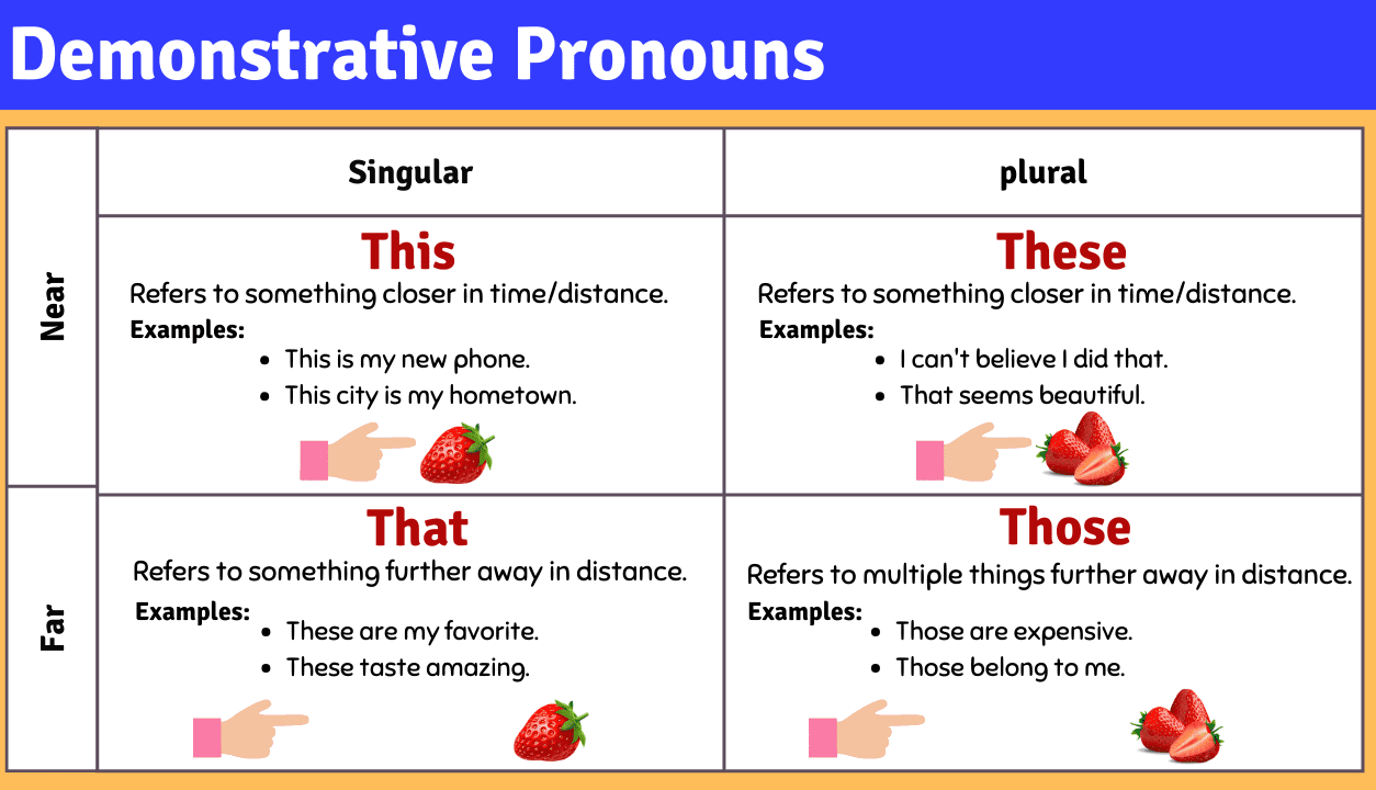 ضمیر اشاره، به اسم اشاره می کند. اگر نزدیک باشد از this و these و اگر دور باشد از that و those استفاده می شود.