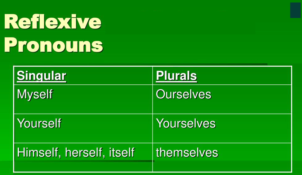ضمیر انعکاسی در انگلیسی، دوباره به فاعل جمله اشاره می کند. در واقع روی فاعل تاکید می کند.